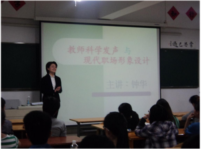 这位长期位居一线的媒体工作者在电视荧屏上以其良好的形象赢得了许多电视观众的喜爱。在这次专题讲座中,钟华老师根据我校师范性质的特点,有针对性地对教师的“科学发声”和“形象塑造”两个方面展开讲解。