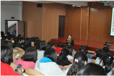 接下来,赵丹老师以现场调查的方式开始了她的演说。在谈到与大学生恋爱过程中的敏感话题——“性”时,她说:“爱他,也要爱自己。谈恋爱,要学会说‘不’;要学会爱自己,对自己负责。”她还说:“学会爱自己首先要有正确的认知,学会珍惜,尊重自己的感情。”