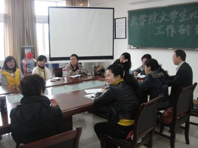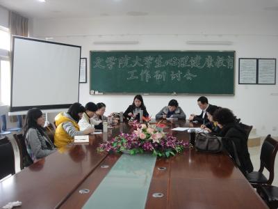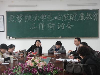 2012年3月16 日下午14︰00至18︰00,文学院党总支副书记王又新主持召开了大学生心理健康教育工作研讨会,参加此次研讨会的有贵阳市心理咨询专家、文学院“午后阳光”咨询老师戴桂蓉、文学院已取得国家心理咨询师资格的刘佳人、张雪二位老师以及文学院所有辅导员。研讨会围绕如何构架文学院学生心理健康教育体系、完善心理健康教育内容与形式、促进学生健康成长和成才这一主题展开了深入研讨。