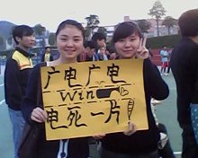 此次比赛的另外一道风景,是11广电班的拉拉队,富有创意标语,格外引人注目。拉拉队员们在不断地为赛场上的同学呐喊加油。当他们进球时,欢呼声改过了这里所有的声音,当他们失球时,加油声也震耳欲聋,震撼全场。