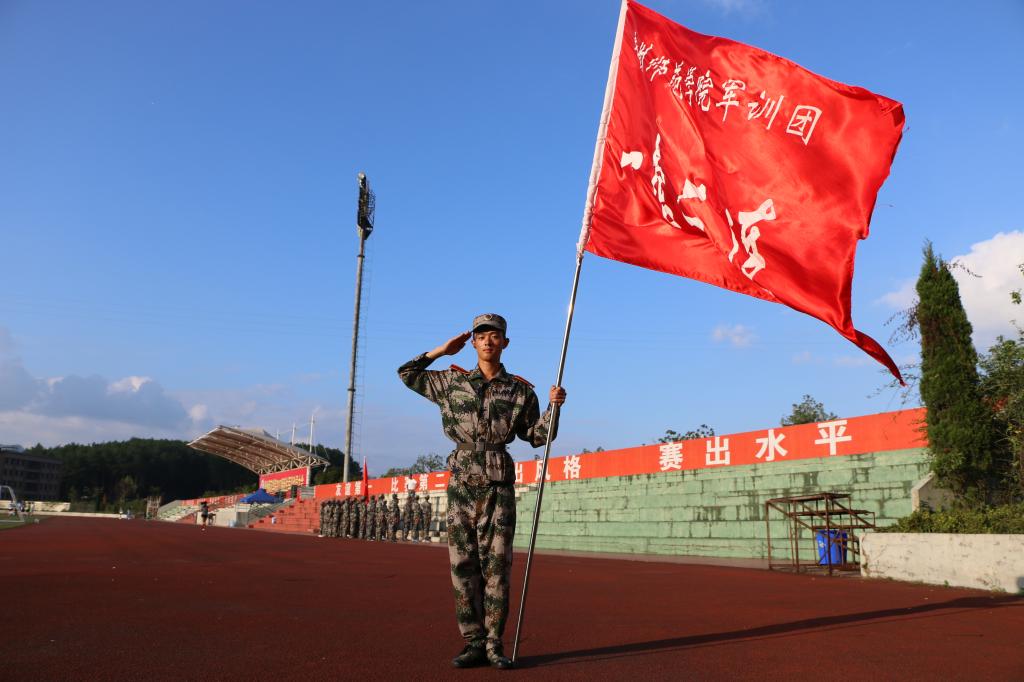 当然,旗手们也不只在前进的队伍中默默地行使着自己的责任,每到临近集合的时间时,总能看见旗手们扛着旗匆匆地往训练场地赶的身影。因奔走而留下的一滴滴汗水,只为能让同学们马上找到组织,帮助教官快速集结队伍。