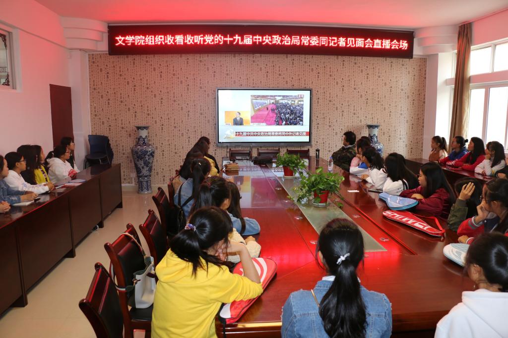 文学院党委积极落实学校党委的部署,按照学校党组的要求,对组织学院师生收看十九届中央政治局常委同记者见面会直播进行了周密安排。10月25日,学院党员干部、党员教师及部分学生代表70余人,在文学院313会议室认真收听收看十九届中央政治局常委同记者见面会直播。广大党员教师和学生认真聆听了习近平总书记的重要讲话,认为习近平总书记话语朴实亲切,内容深刻,表达了党中央对人民的热爱之情和为人民创造美好生活的信心,倍感振奋、深受鼓舞。