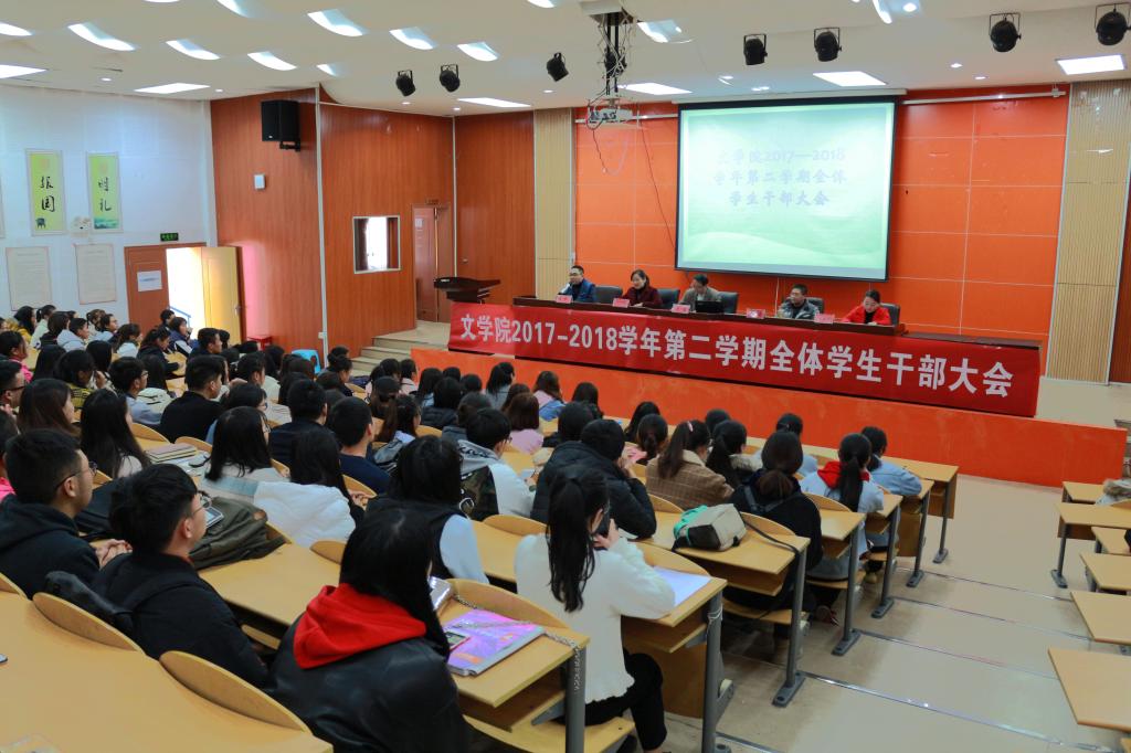 3月6日中午,文学院2017-2018学年第二学期全体学生干部大会在文韬苑三楼学术讲堂召开。院长吴俊、院党委副书记陈亦桥、副院长刘海涛、院团委书记詹峰、专职辅导员蹇登绯老师出席会议。学院学生党员及预备党员、团委学生会干部、2015、2016、2017级各班班委、社团主要干部、其他校学生组织干部参加了本次大会。会议由团委书记詹峰主持。