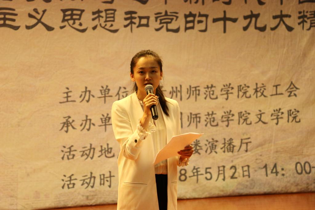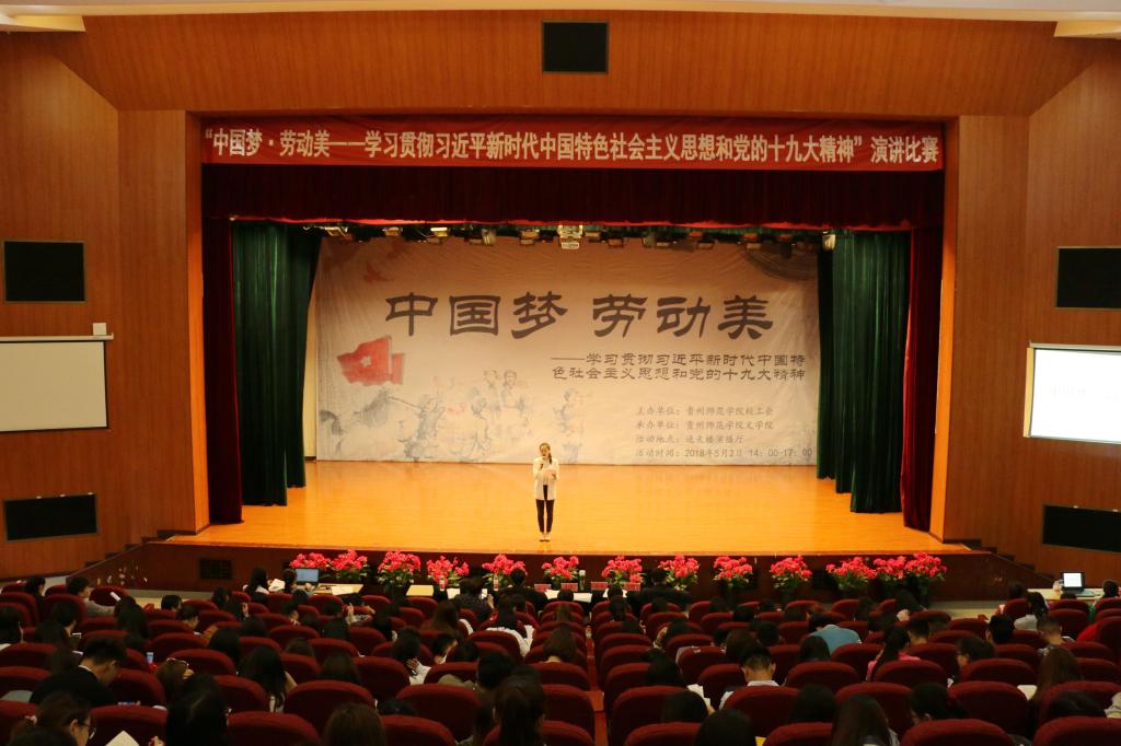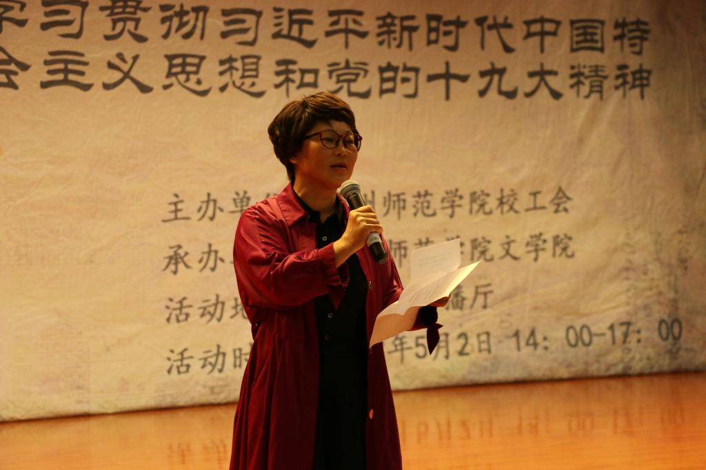 工会主办、文学院承办的“中国梦•劳动美——学习贯彻习近平新时代中国特色社会主义思想和党的十九大精神”演讲大赛在逸夫楼演播厅举行。校党委副书记令狐彩桃出席,校发展规划处处长姜东、文学院院长吴俊、文学院副教授张莉珊、艺术学院副教授刘临洪、外国语学院教师张羽担任评委。