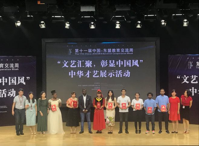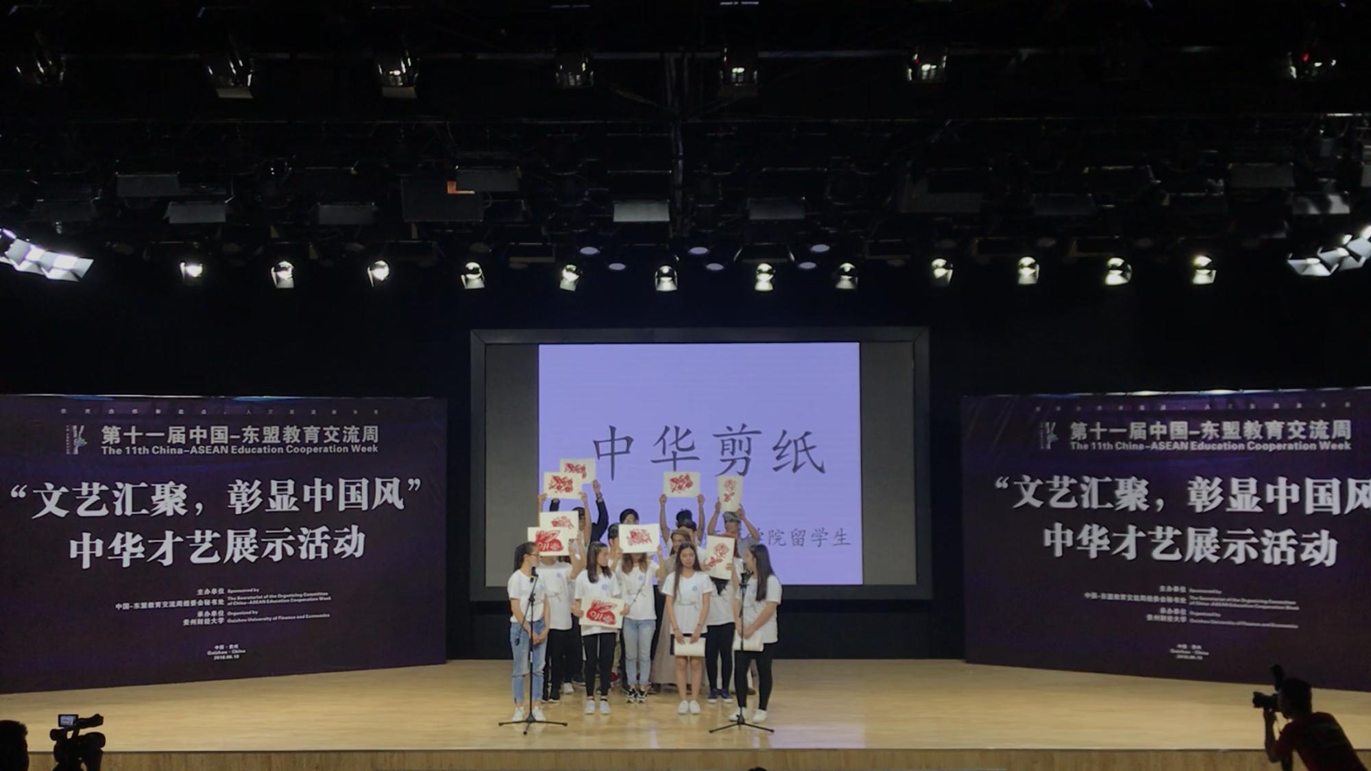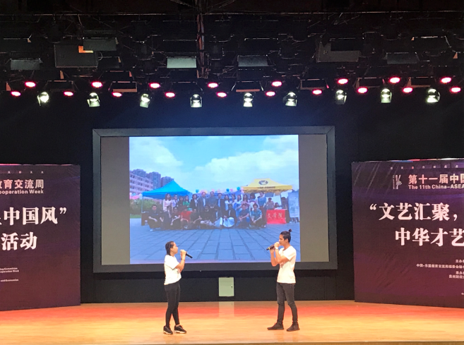 6月19日下午,由中国——东盟教育交流周组委会主办,第十一届中国——东盟教育交流周之“文艺汇聚,彰显中国风”中华才艺展示活动在贵州财经大学举行。来自省内外各高校的14支留学生代表队伍参加了此次活动,我校文学院;留学生班主任王蕴华、科任老师徐望带领我校留学生队伍也参加了本次活动。