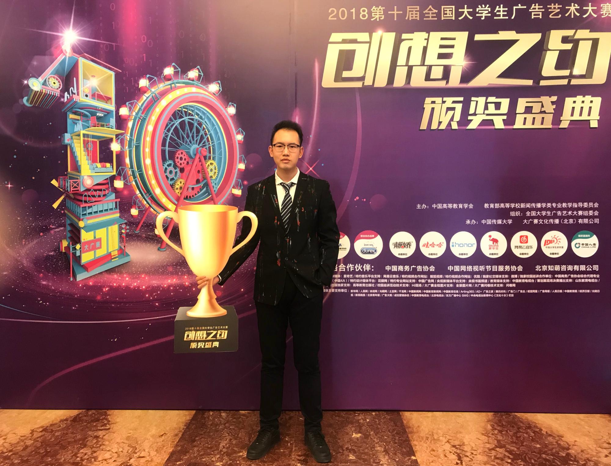 16级赵伟韬同学主创的视频类影视广告作品《现在就出发》(指导老师:娄立原)更斩获全国级二等奖,赵伟韬同学作为获奖代表上台领取了获奖证书和奖品。