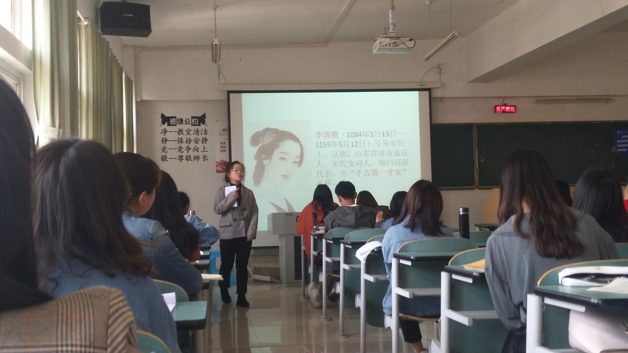 陈旭琳同学为学生们讲授了李清照的代表作《如梦令》,让同学们亲身体会了学姐的课堂实践,体会教学技能的重要性。授课中陈旭琳思路清晰,为同学们解说宋词,课堂氛围融洽。授课结束,同学们向其请教了关于在乐湾实习、任教的经验。