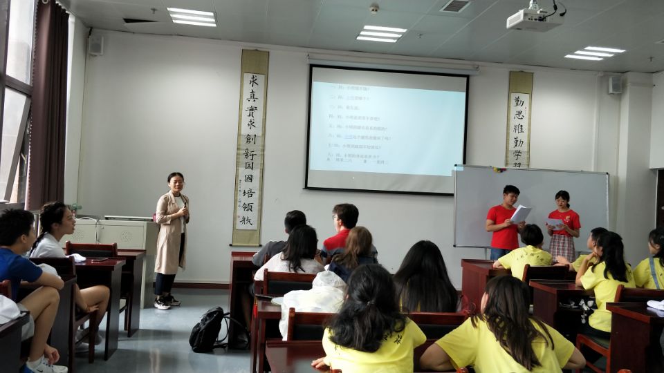 营,营员们度过了愉快地学习时光。今天的第一节课是汉语听说能力训练。原本以为是放听力录音毫无意思的课程,没想到王老师以听歌问答的形式开始。老师选取的歌曲充分调动了大家的积极性,营员们开始嗨起来了!你说我猜环节,大家热情参与,整个课堂气氛十分活跃。