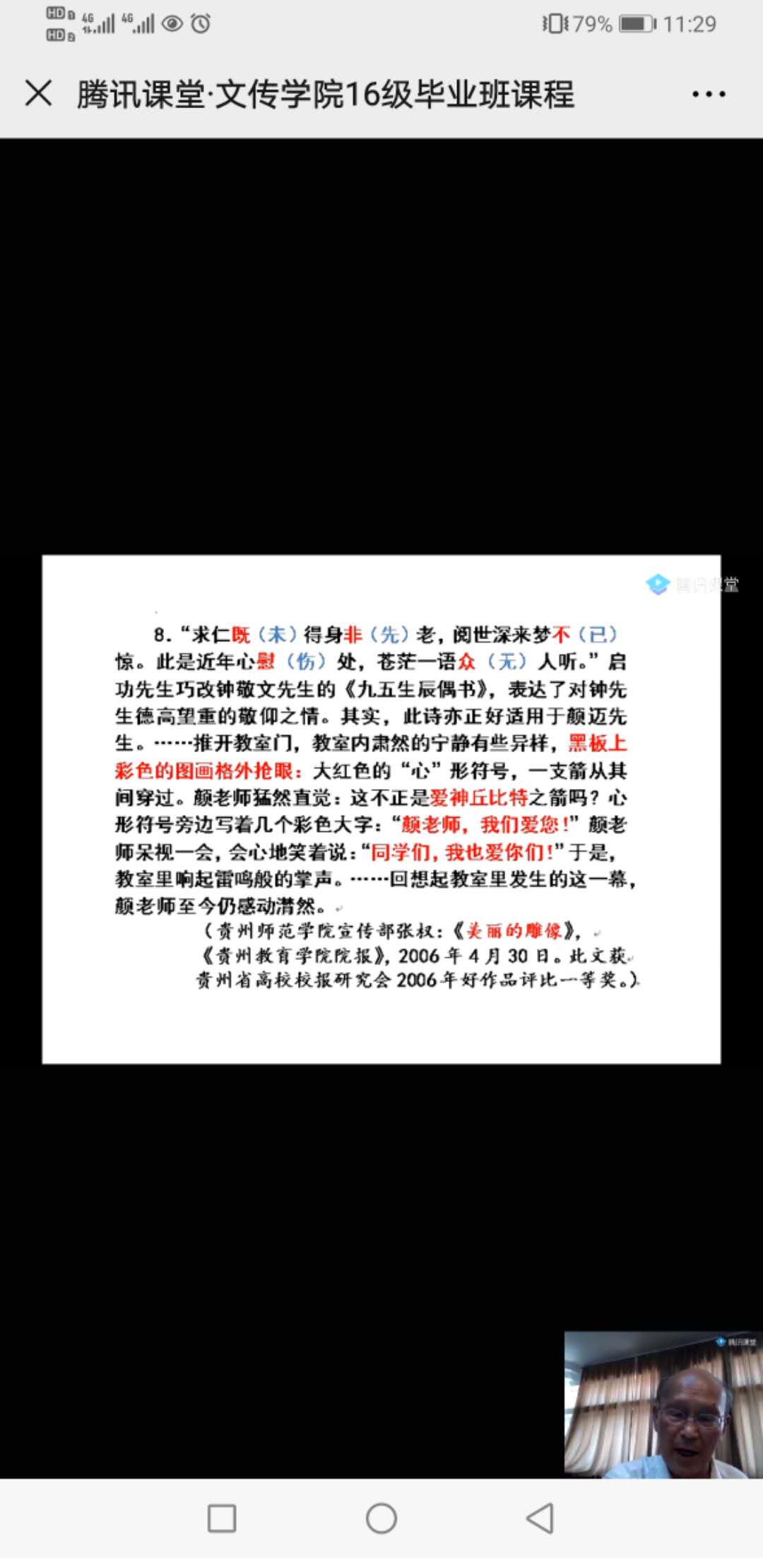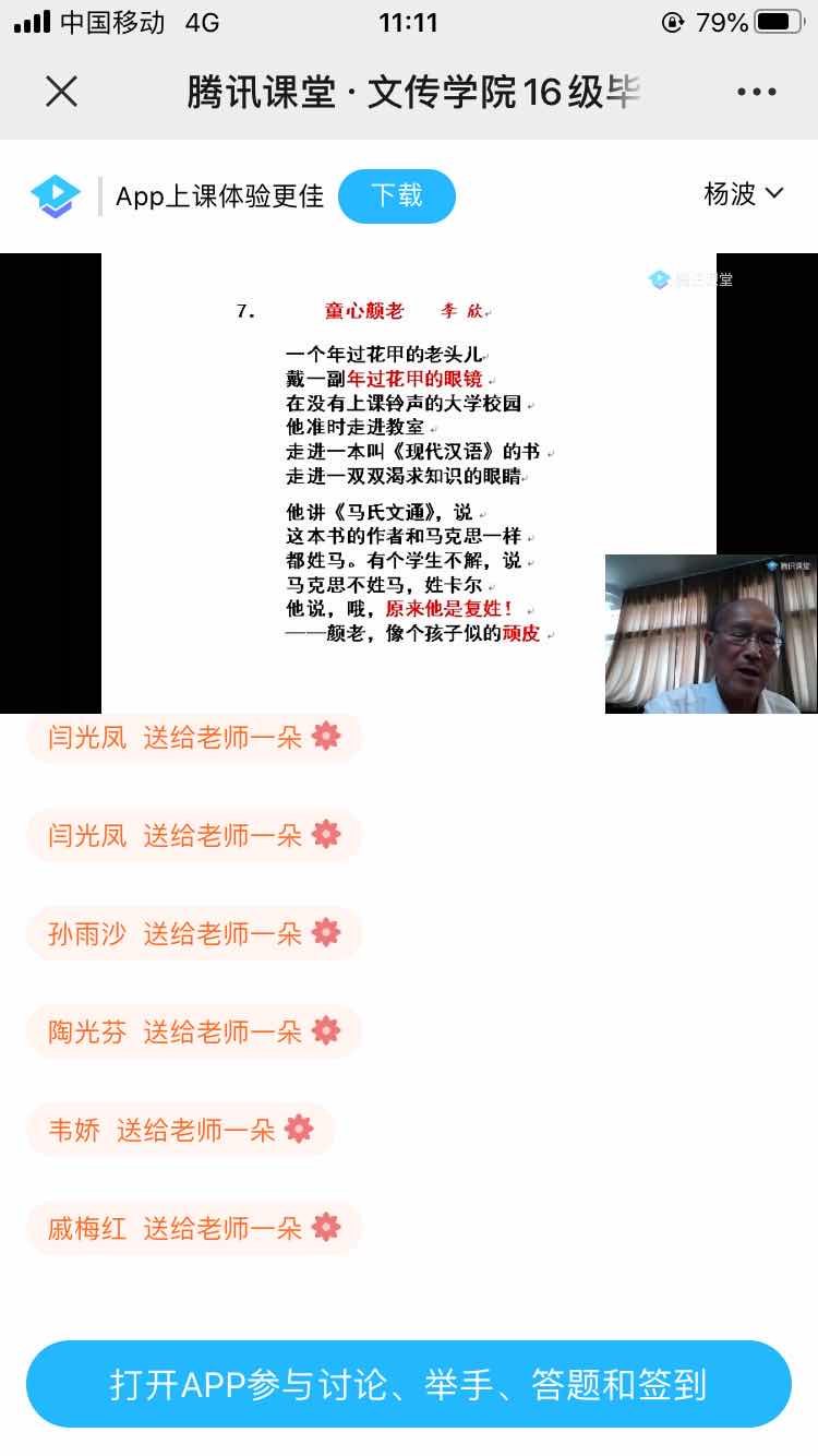 颜迈先生的授课主题为“永远的天边线—与同学们漫话人生”,颜老先生讲课以自己的诗歌《黄昏遐想:大海》《黄昏遐想:天边线》开篇,以自己“天边线作自己的目标”的人生格言来引导学生。颜迈先生向同学们介绍了自己的教学历程、研究成果,以及自己在教学和研究过程中的精彩小故事,并借鲁迅、但丁等的名人名言来剖析自己的耕耘之旅,用自己与贵州教育学院中文系学子李欣、张超、张权等的教学相习、教学相长的事迹激励同学们在毕业后不畏艰难、努力进取,作最好的自己。颜迈先生的讲课温言细语、娓娓道来,循循善诱、如沐春风,讲课过程中互动不断,点赞不断,使2020届毕业生在离校前享受了一份精神盛宴。讲课最后颜迈先生与动漫下载
