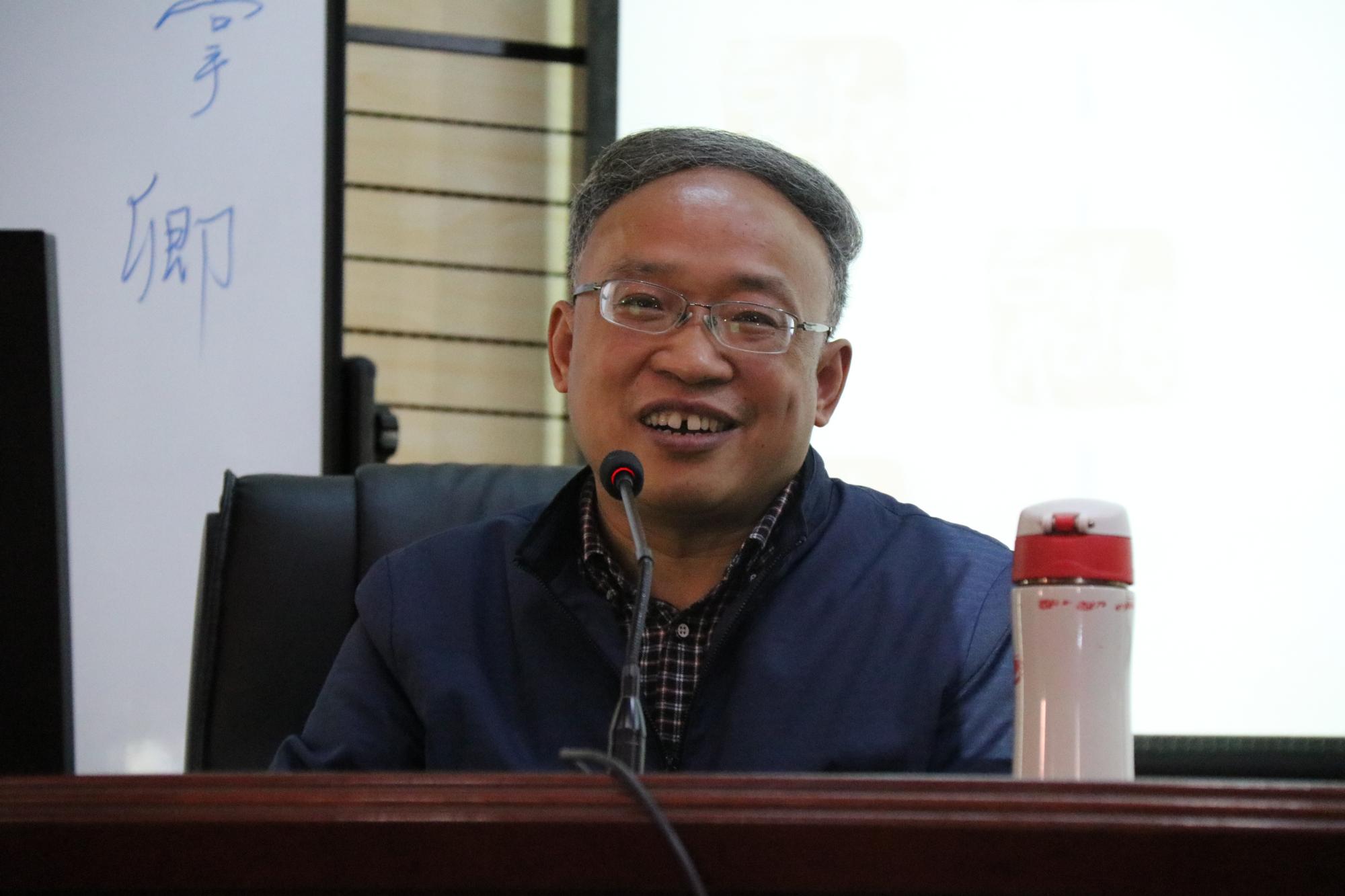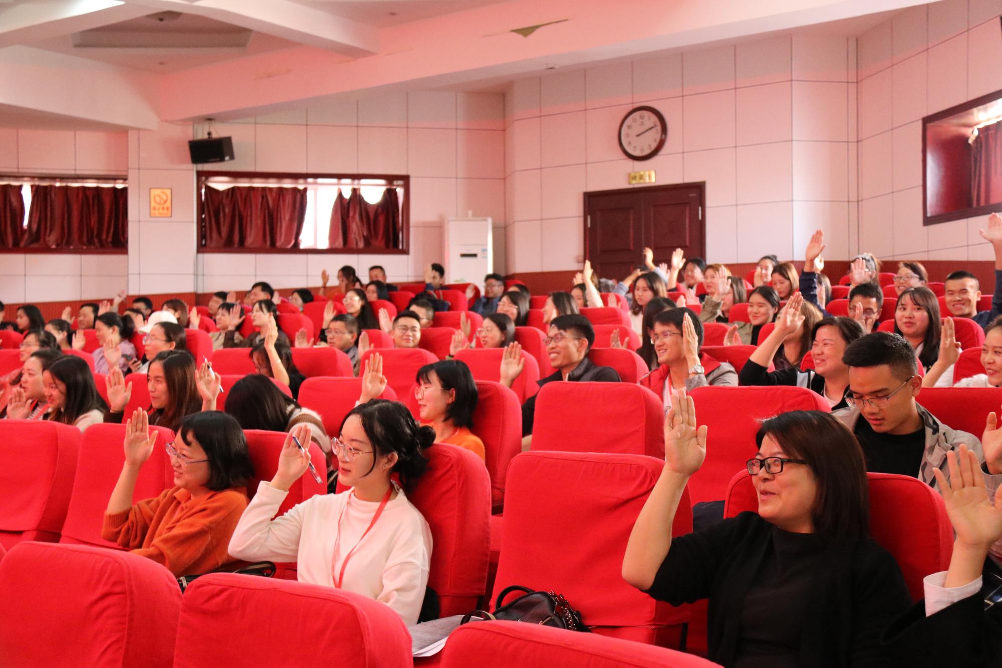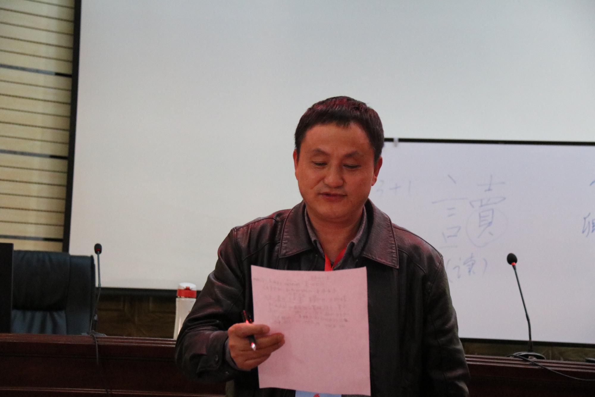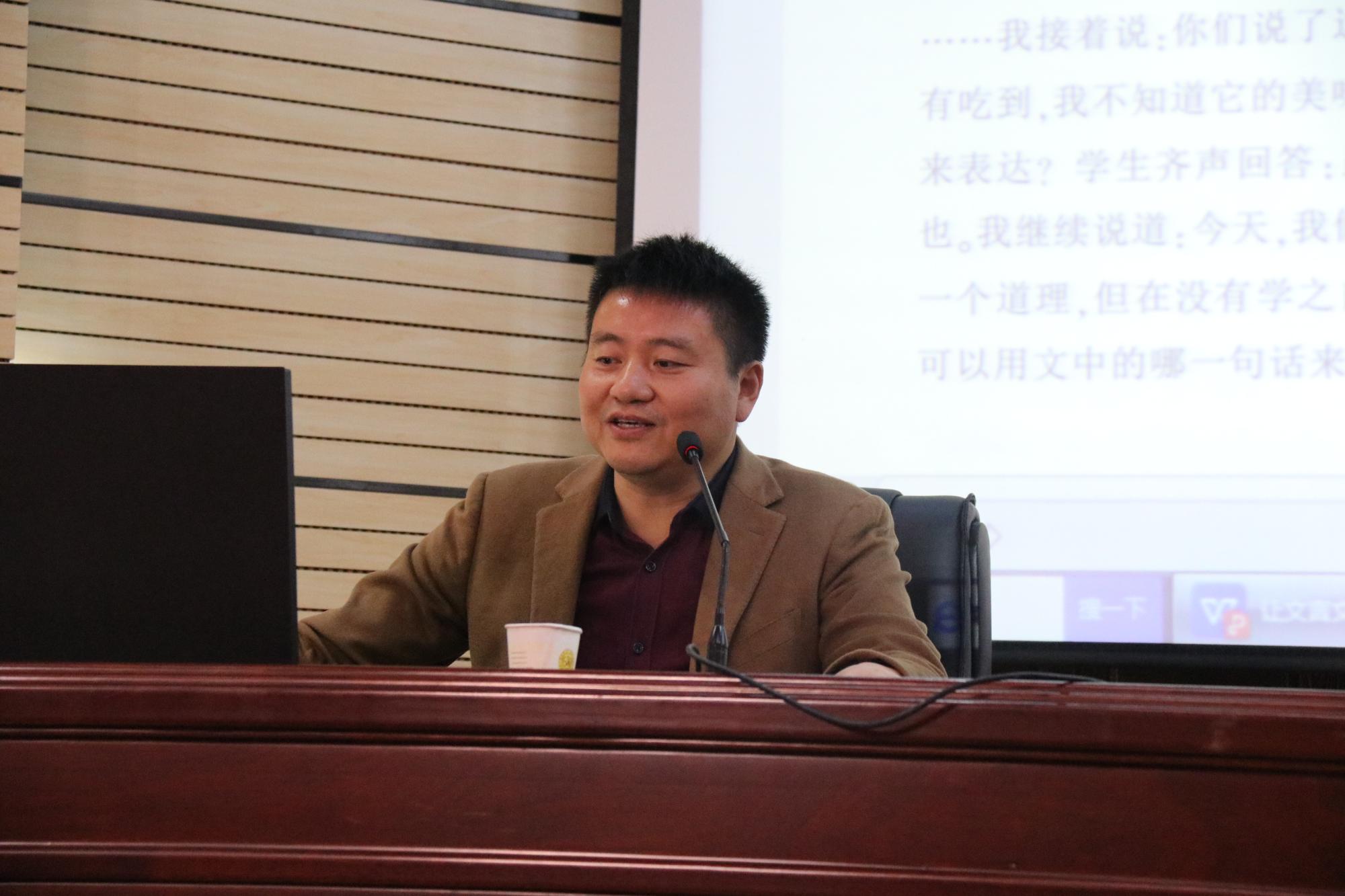 卿平海老师的专题是“部编教材初中语文阅读教学理论与实践”。作为四川省特级教师,卿平海老师的讲授也极富特色。卿老师以“掌”字拉开了讲座的序幕,讲述“掌”的含义,引出举手、握手等动作内容,并让学员们进行互动。卿老师让学员们在纸上将之前的活动写成文字,再进行多次修改并让学员分享自己的书写内容。卿老师指出,要在生活中、活动中,引导学生体验生活,让学生知道怎么写、写什么,在此基础上再谈引导学生修改作文、互评作文等。卿老师还强调说,新课程的写作是在写中培养写作,缺乏写作实践的作文教学肯定是失败的。最后,卿老师以《纸随心飞》的教学设计为例,讲解了学情预估、写作课型、教学立意、目标预设和教学时间等问题,并重点分析了初中各个年级大作文如何教学、初中写作如何攻坚克难等教学难点。