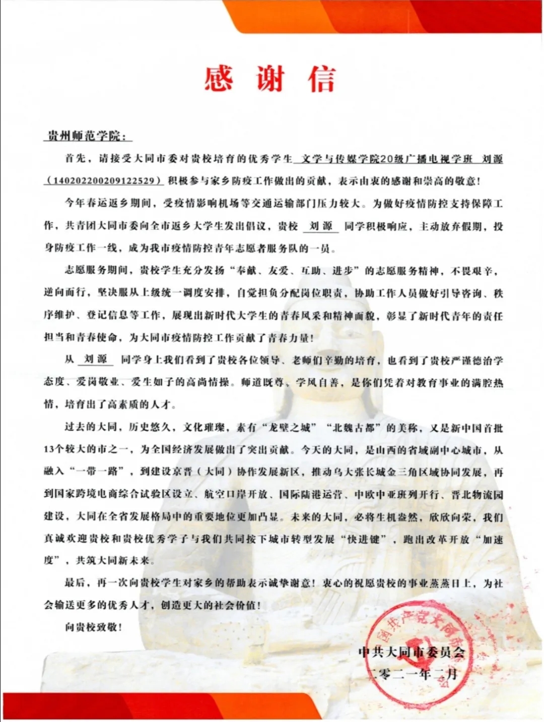 20级广播电视学专业的学生,在春运返乡期间,成为山西省大同市疫情防控青年志愿者服务队的一名队员,加入到了此次疫情防控中去。