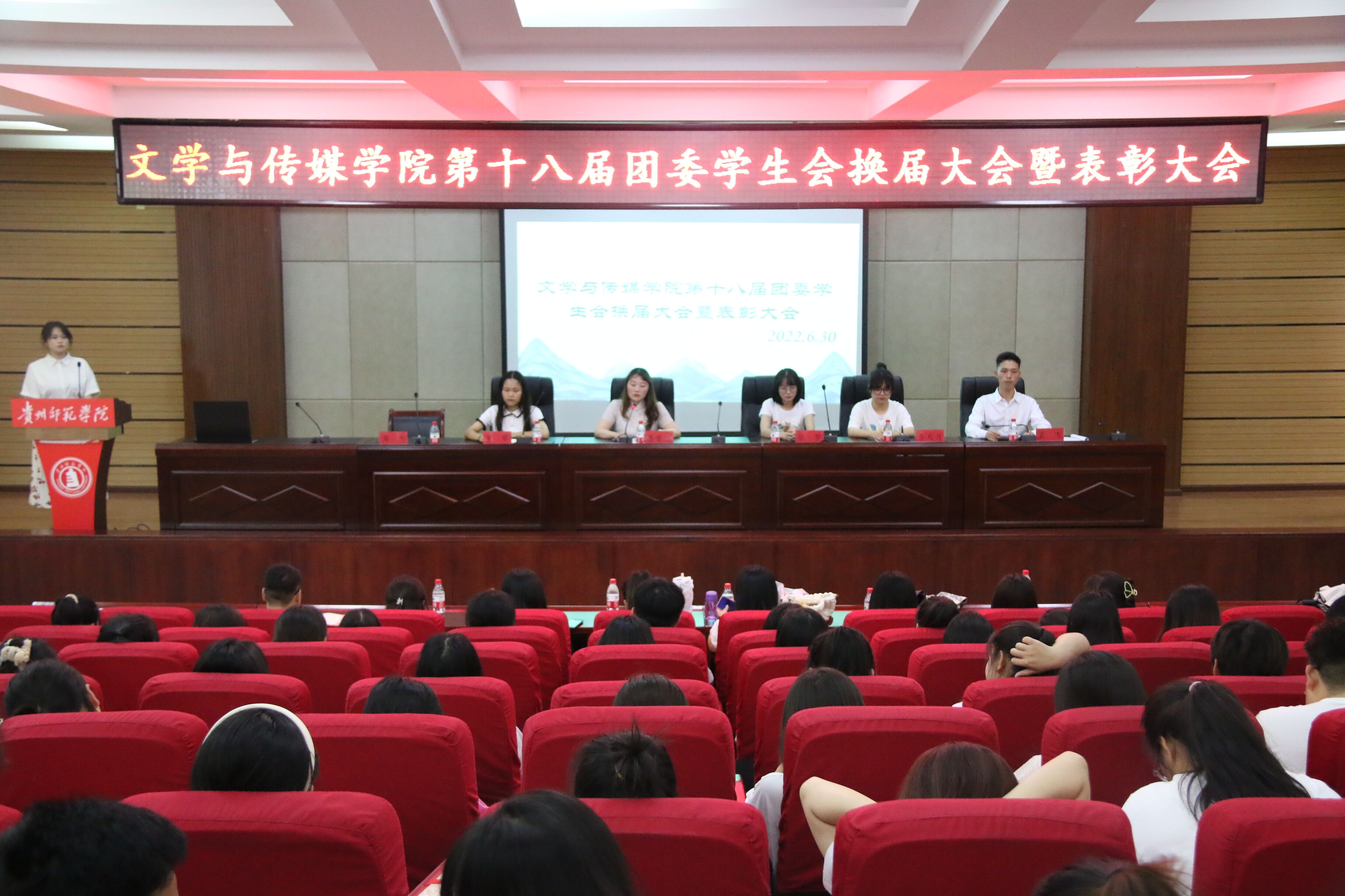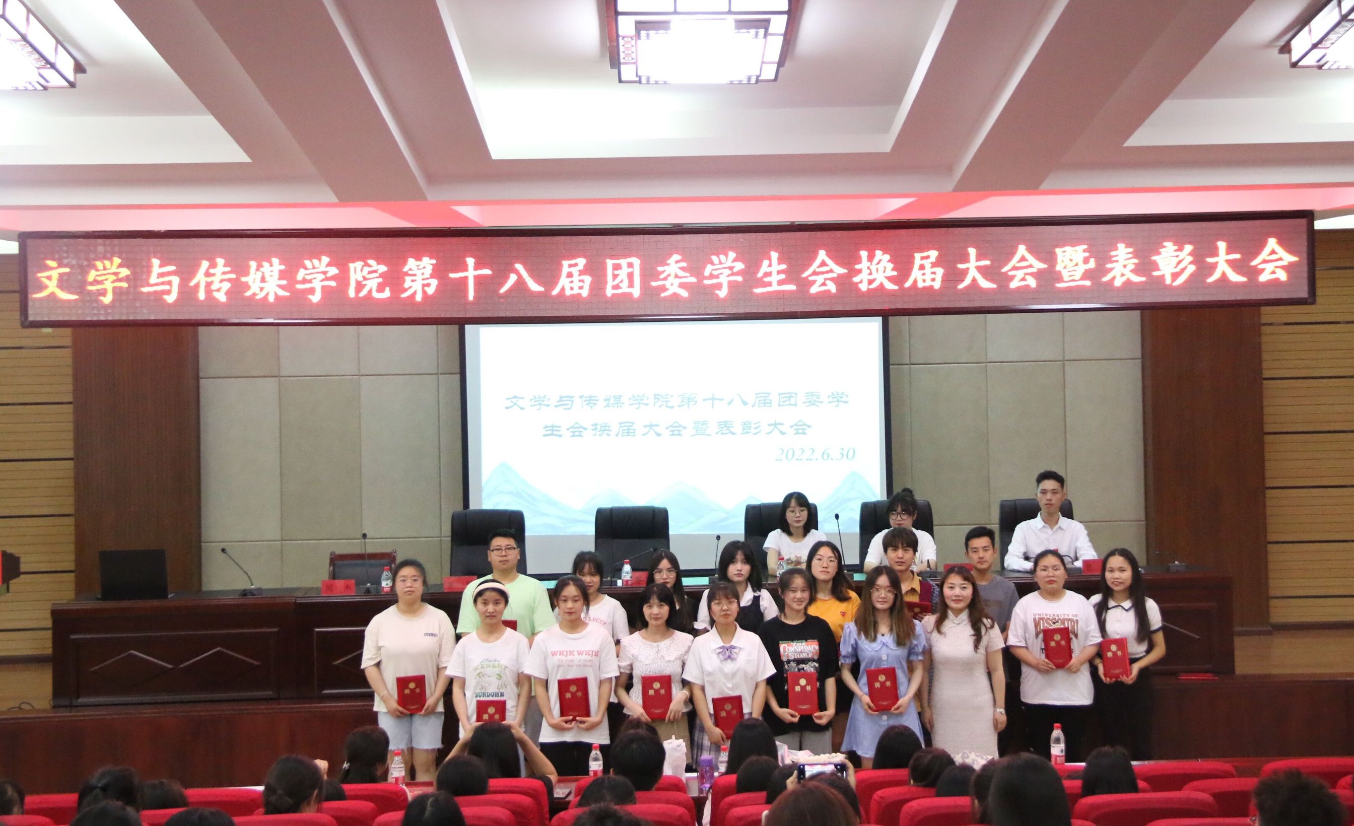 于明辨楼道德讲堂举行了第十八届团委学生会换届大会暨表彰大会,团委书记蹇登绯、学生会全体成员参加了此次会议,会议由第十九届团委副书记周杰主持。