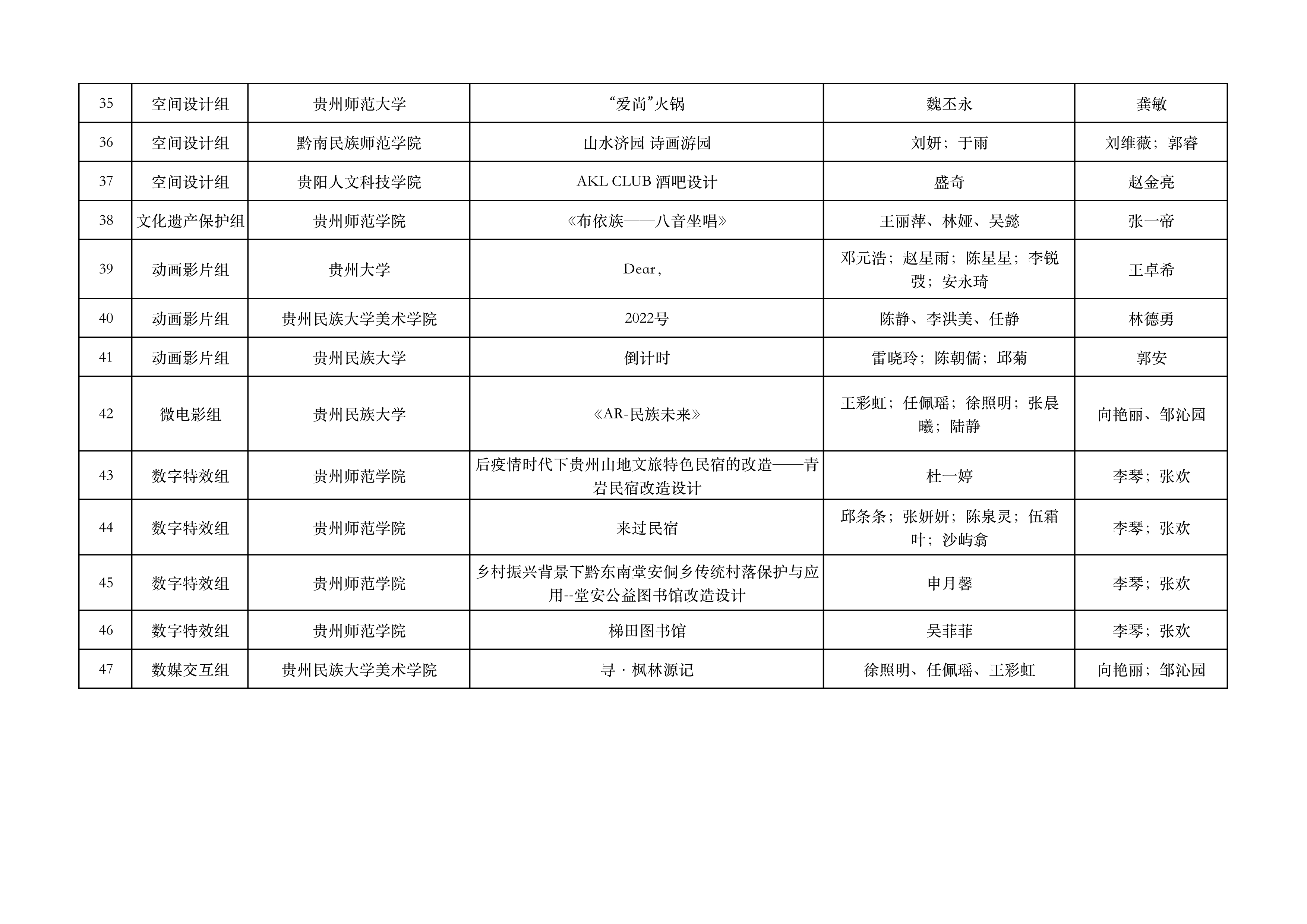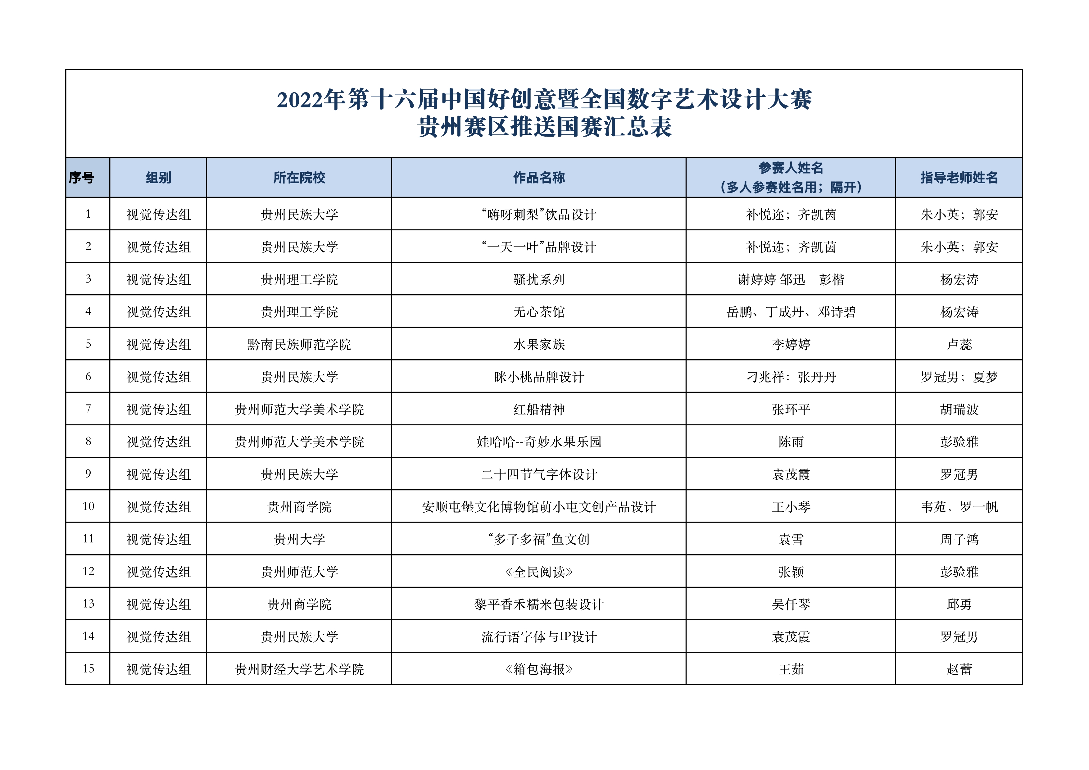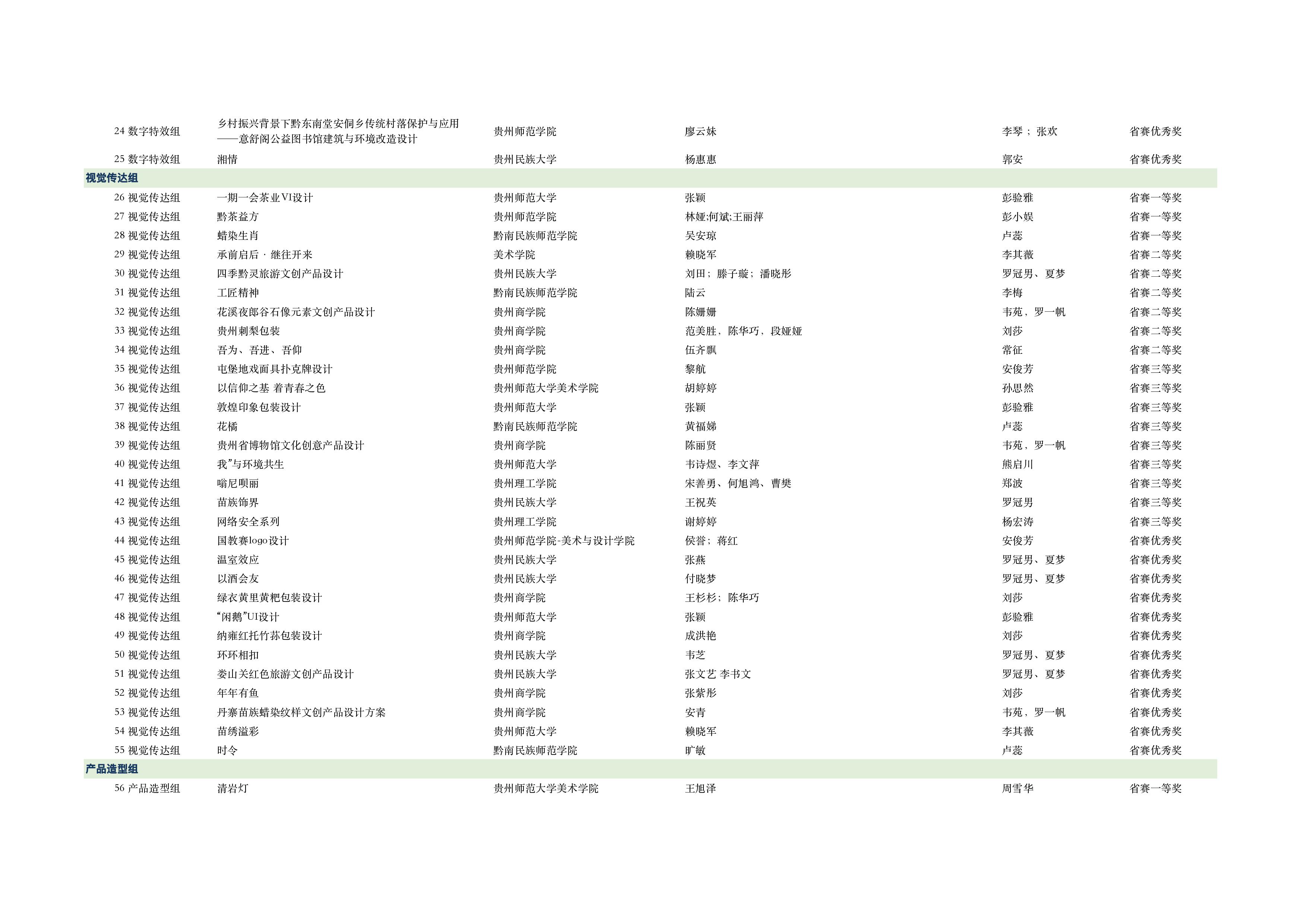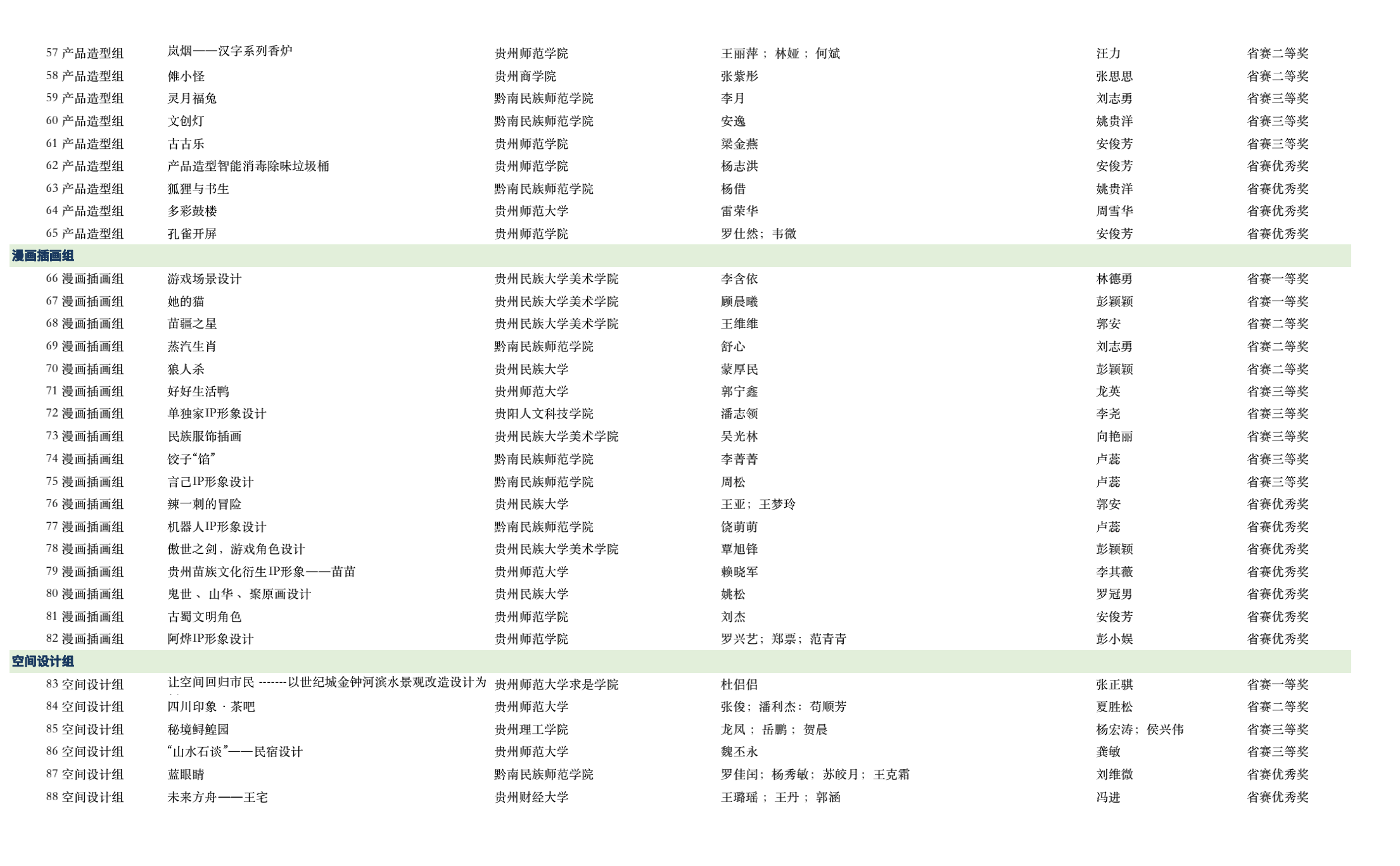 大赛从贵州省赛专家库中邀请到贵州大学、贵州师范大学、贵州理工学院、贵州民族大学等省内高校及多位业界知名专家共12位参与评审工作。经省赛评审专家多日的认真甄选、评分,最终评选出47件优秀作品报送国赛组委会,参与国赛的评选。同时,88件作品获得省赛等级奖及优秀奖。