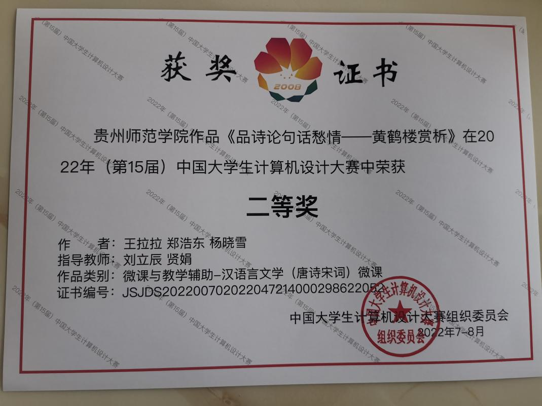 教师刘立辰、贤娟指导,王拉拉、郑浩东、杨晓雪三位同学共同创作的微课作品《品诗论句话愁情——黄鹤楼赏析》,斩获“微课与教学辅助”类国家级二等奖。