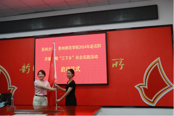 “知音”黔行实践团队、苏州大学文学院筑梦“黔”行实践团队授旗。实践队成员杨福娜、季钰分别代表两院实践团队成员进行发言。