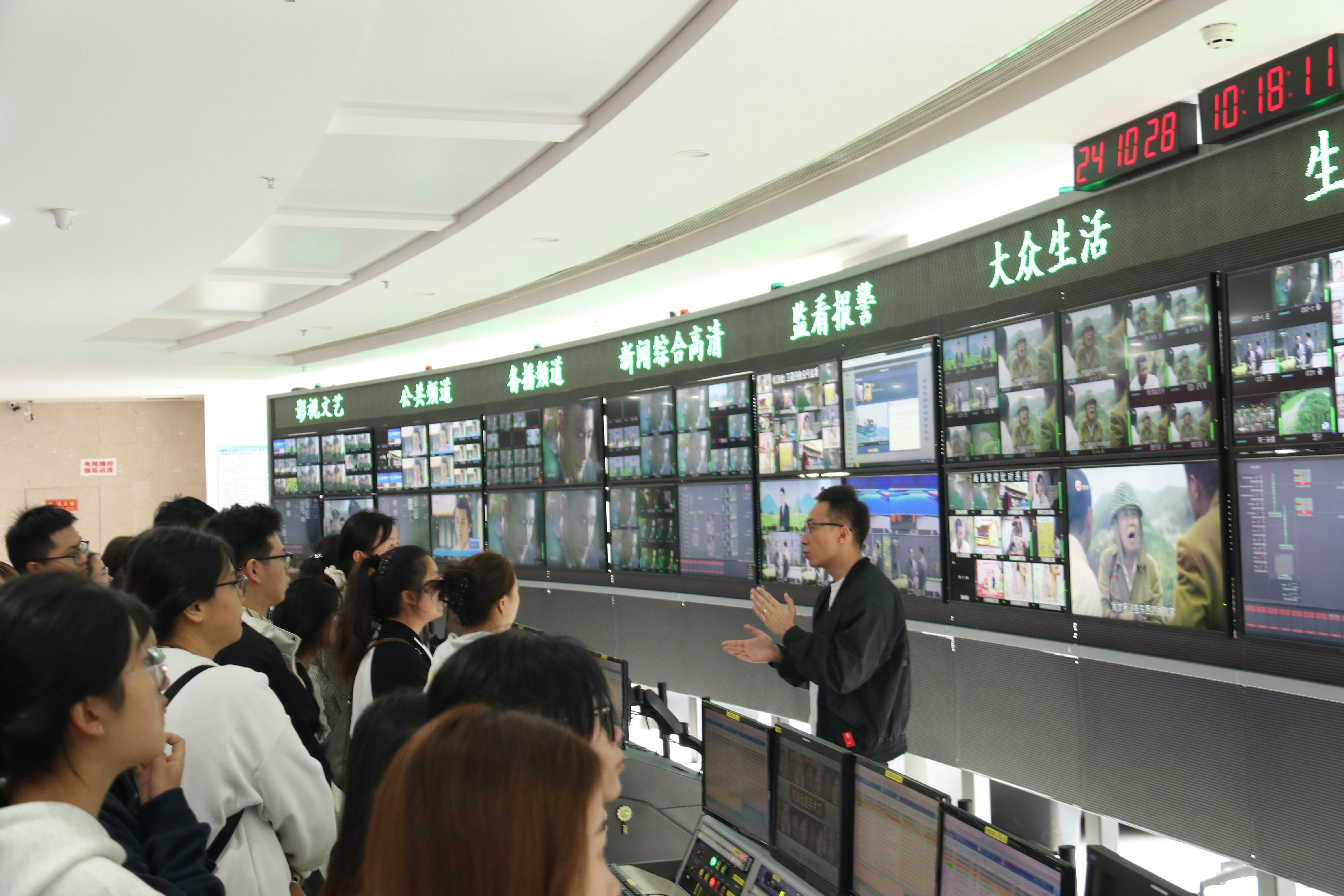 紧接着,贵州广播电视台新媒体技术部主任祝晶带领同学们参观电视台的发展历程展览,感受贵州广电的发展历程,讲述各类设备的演变和技术进步。随后,同学们先后走进了贵州广播电视台演播大厅、融媒体中心、播控传送中心及卫星信号发射监控室等。通过近距离接触广播电视行业的一线操作平台,同学们深入了解了电视高清演播室系统的工作原理和操作流程,不仅加深了对专业知识的理解,也感受到了内容生产和融合传播的“新质生产力”,深刻感受改变原有的传播体系,为视频内容的创新表达创造了更多可能性。活动中,祝晶强调技术创新对于推动行业发展的重要性,同学们不仅要对电视行业的过去有深刻认识,还要对未来充满憧憬和期待,为地方新闻传媒事业贡献出自己的一份力。