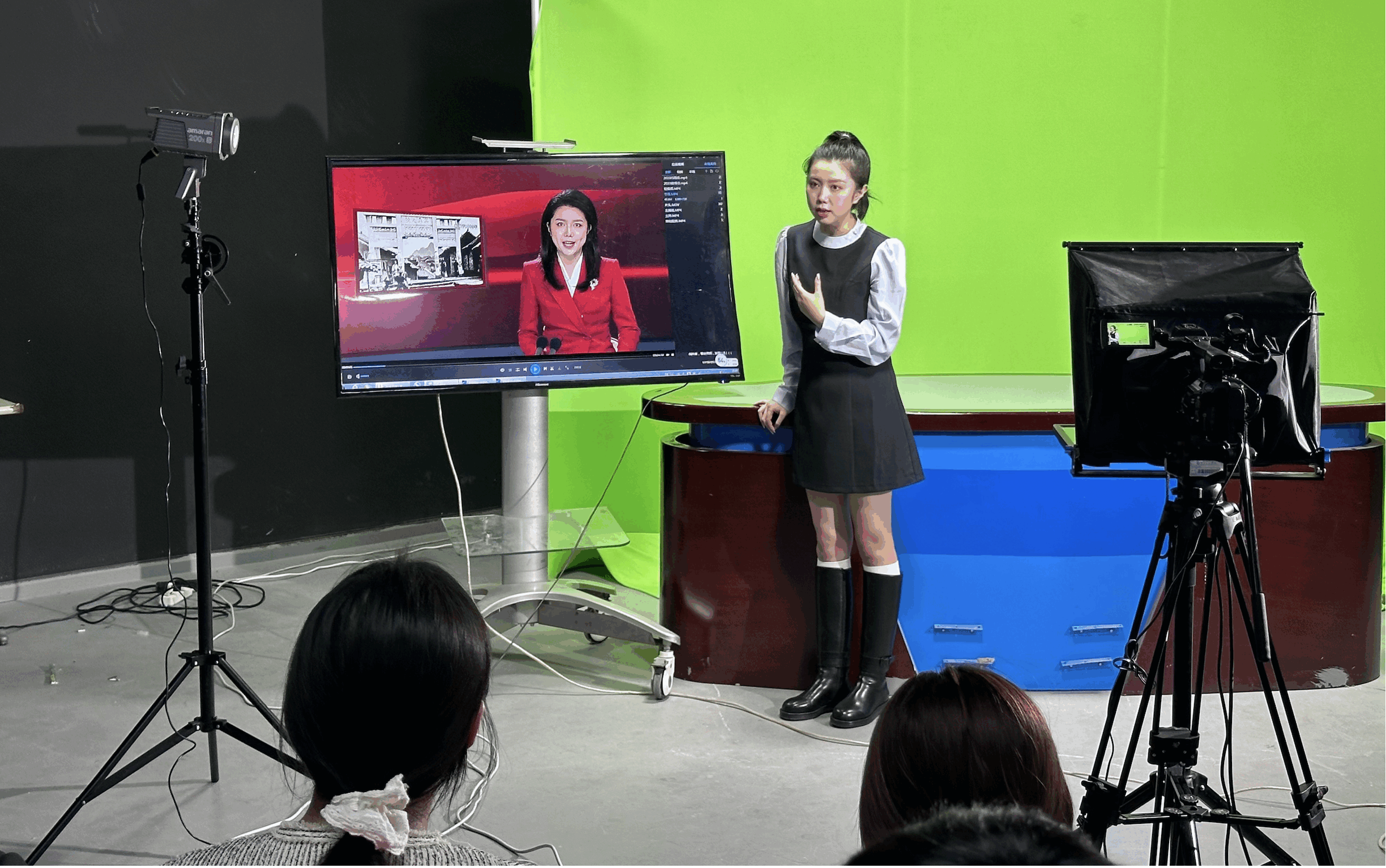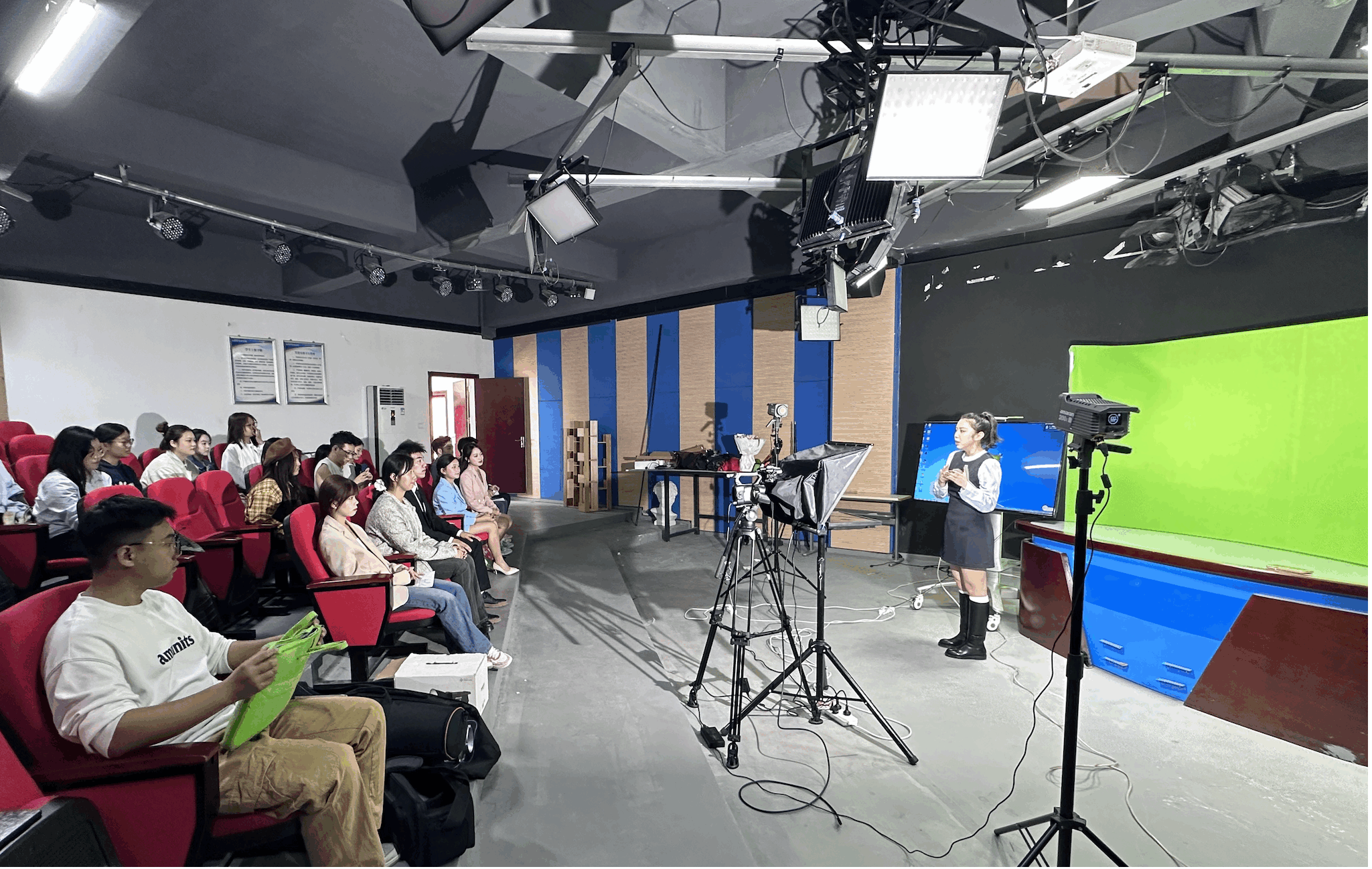 在宁静楼627演播厅开展《电视栏目创作实践》实践周主题活动——电视新闻栏目播音技巧。