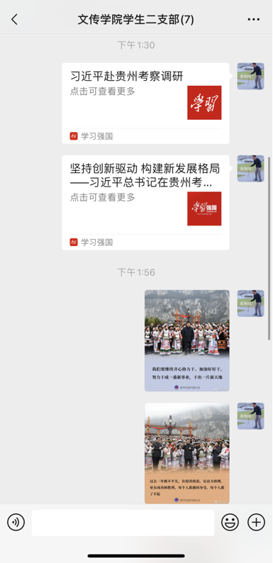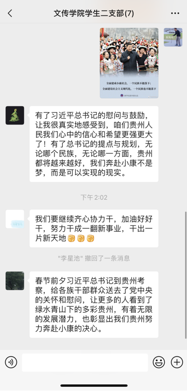 传媒类学生党支部组织学习贯彻习近平总书记视察贵州重要讲话重要指示精神。支部上下掀起学习贯彻习近平总书记视察贵州重要讲话的精神热潮,支部利用线上网络学习平台组织开展学习研讨活动,党员同志积极分享心得体会。
