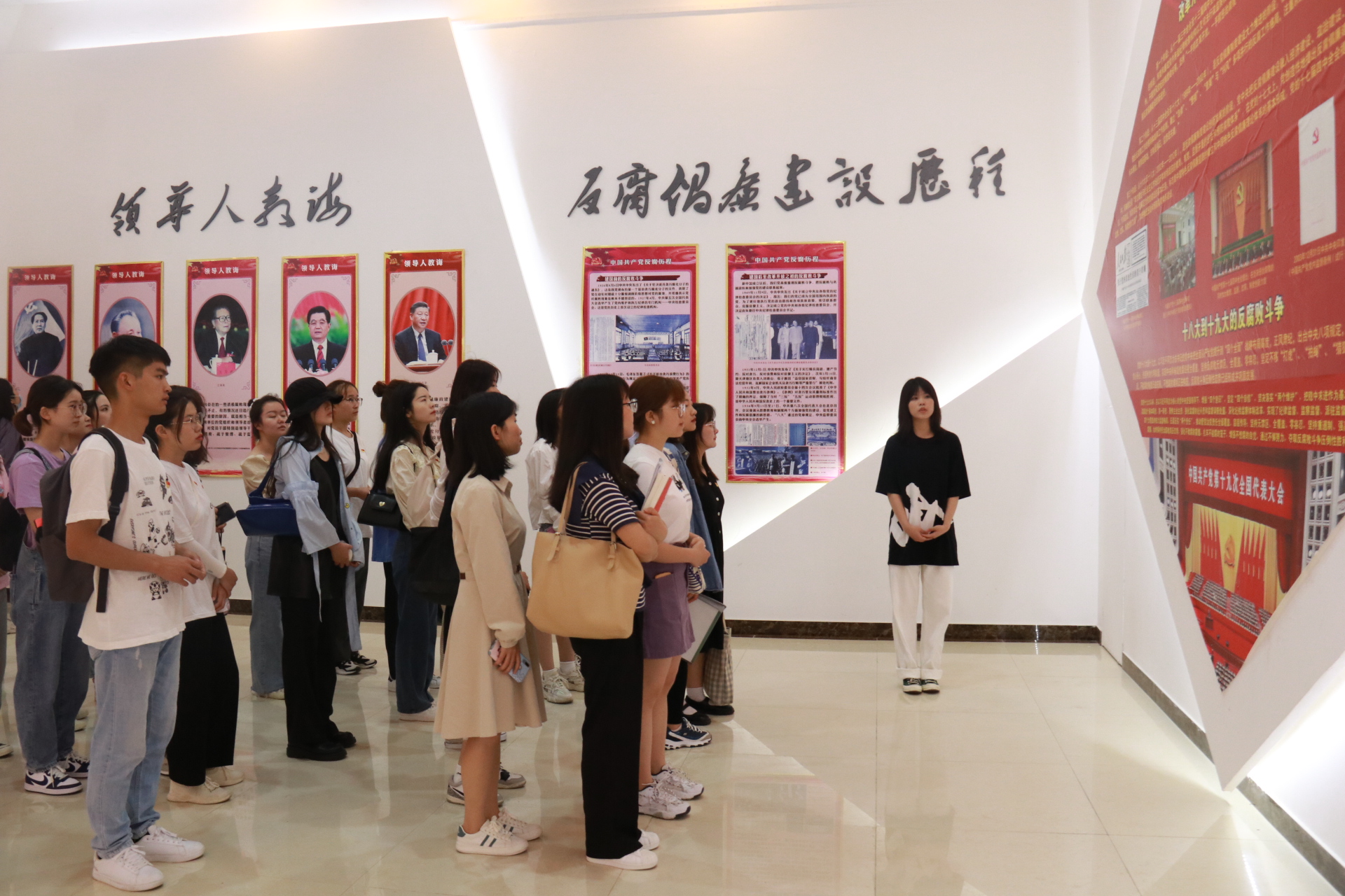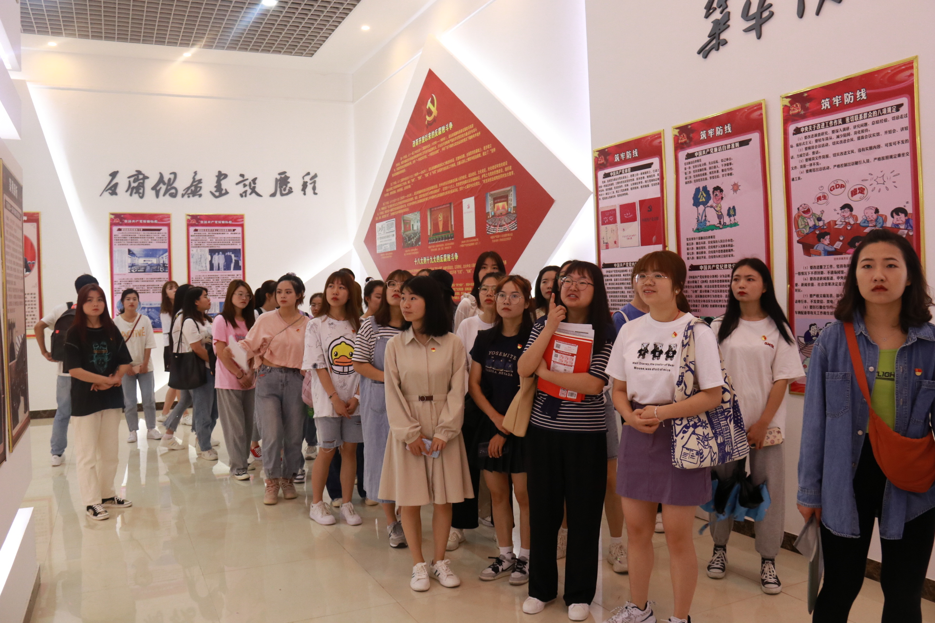 在解说员的介绍下,学员们逐一参观学习了“党的发展历史”、“领导人的青春岁月”、“基层好党员好楷模”、“不忘初心、牢记使命主题教育成果”、“反腐败斗争”等专题板块。一篇篇文字记载,一幅幅真实图片,带领同学们走进了党的记忆,走进栩栩如生的往昔。