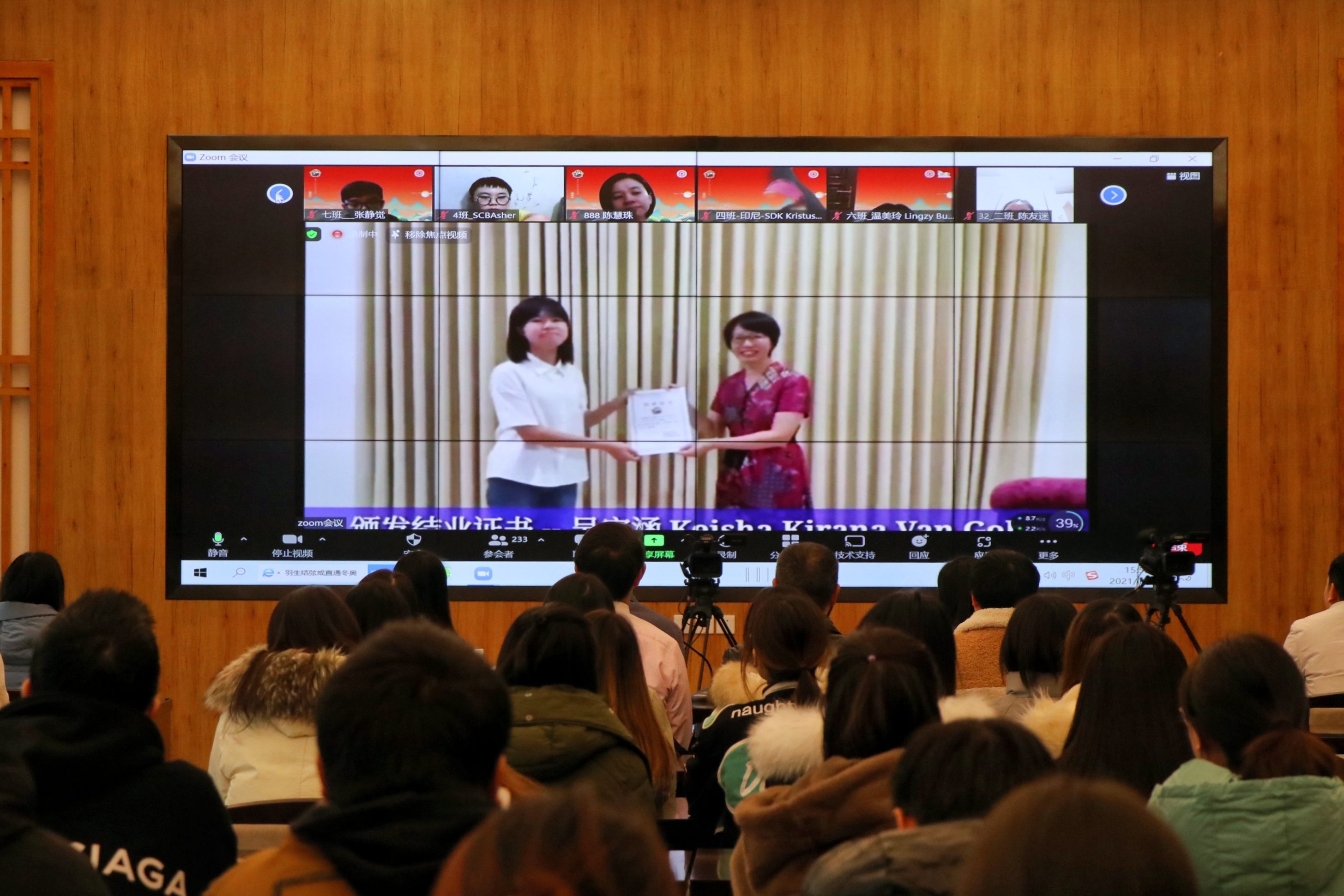 在闭园仪式上,学员们通过视频进行了学习成果汇报,展示了自己在线上学习中国的书法、绘画、武术(太极)、歌曲、民族舞蹈、中国结、中国剪纸、陶艺等方面的收获。老师还为同学们颁发了结业证书和优秀学员证书。
