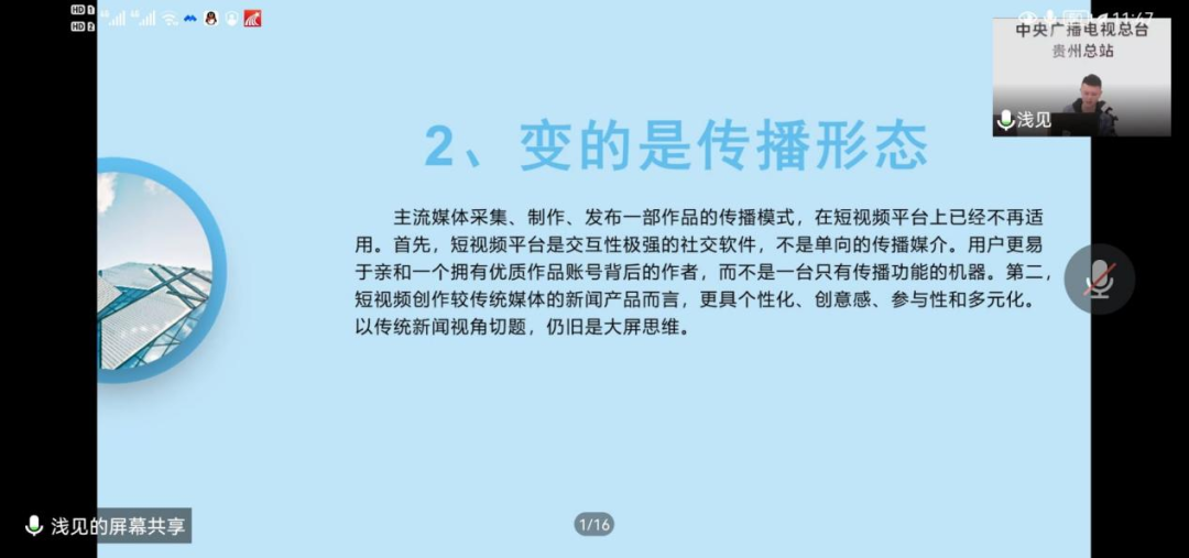 本网讯  五月十六日,2021级广编班和广电班在中央广播电视台贵州总台尹平、安楠老师的指导下,通过腾讯会议线上学习了“《今日中国》看今日贵州”和“新媒体的行销密码”两项内容。