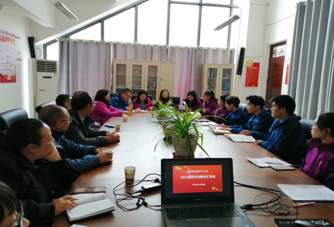 首先由8位实习生汇报实习期间的收获和成长。各位实习生分别从教育教学、班级常规管理、教学反思等方面进行了汇报。经过这两个多月的实习以及在各位指导老师的帮助下,无论是教育理念的形成、教学方法的积累,还是教育能力的提升上,同学们都有了不少的收获。