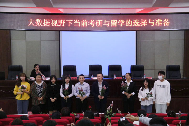 第二个环节是张连桥教授为同学们讲授大数据视野下当前考研与留学的选择与准备。他首先谈到当前考研的主要困难:第一是基础薄弱主要表现在四六级未过、经典著作阅读较少;第二是观念问题,同学们容易妄自菲薄并且雄竞不足;第三是家庭因素,大多数家长对于孩子的未来只希望他们能找到一份工作就行,保底意识过强,其次是经济条件不允许;第四是学校未营造升学深造的良好氛围,只有当调动每个老师、学院、同学的积极性,升学深造的氛围就能营造起来。