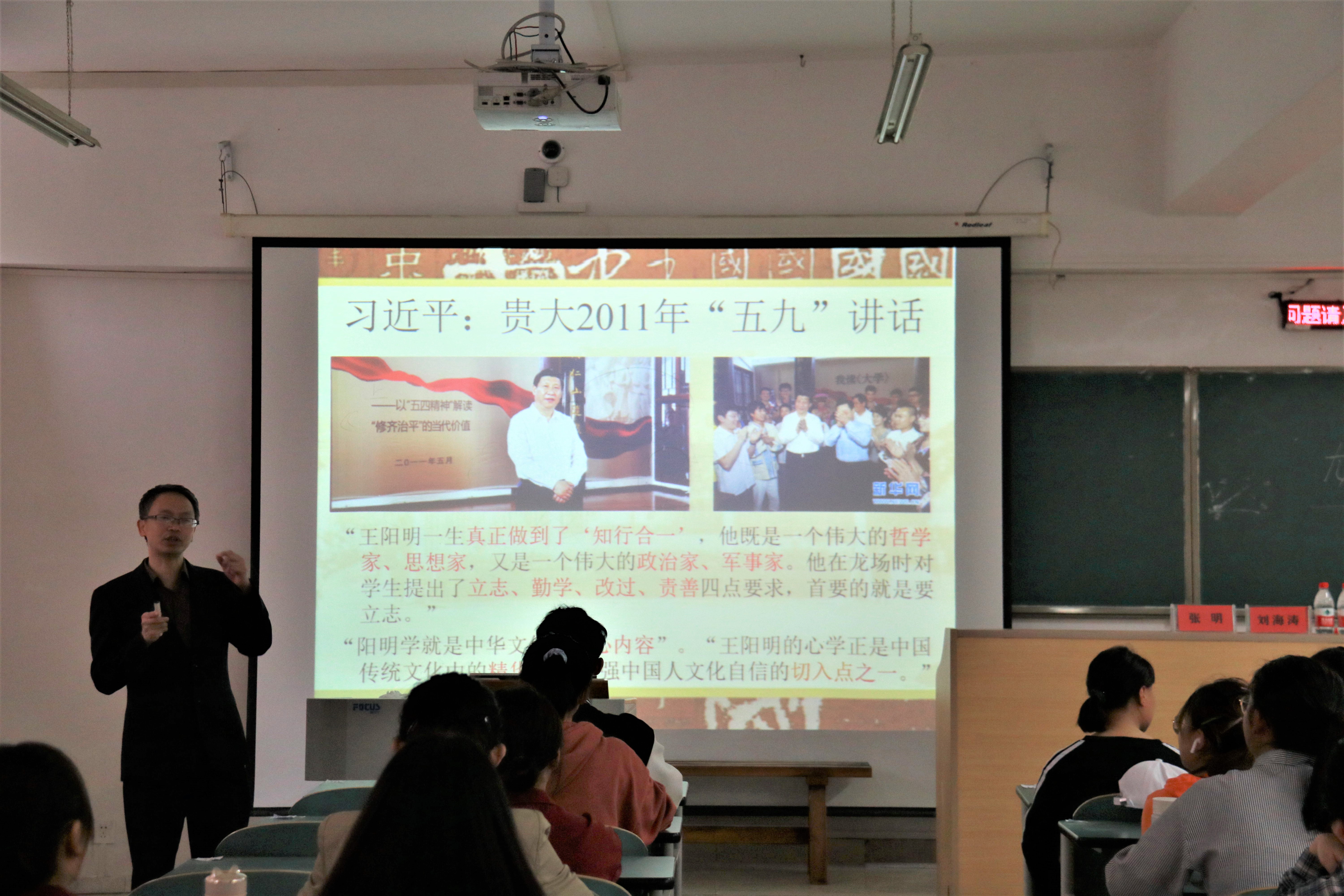 讲座开始,张明首先分享了习近平总书记2011年在贵州大学文化书院发表的“5·9”重要讲话中对王阳明的评价,指出王阳明的“知行合一”思想及“阳明心学”对中国文化的作用。 他从“王阳明其人与他的时代”、“王阳明龙场悟道”、“阳明心学的内容”、“阳明心学对贵州文化的影响”四个主要方面讲述了王阳明“跌宕起伏”的一生,指出王阳明是最早到贵州少数民族地区的儒家学者,对贵州的贡献不仅在于传播知识,还促进了贵州各民族的融合。在中国特色社会主义建设过程中,研究阳明学对于继承和发展中华优秀传统文化,对于解决当下社会的诸多问题,都具有积极的启示意义。